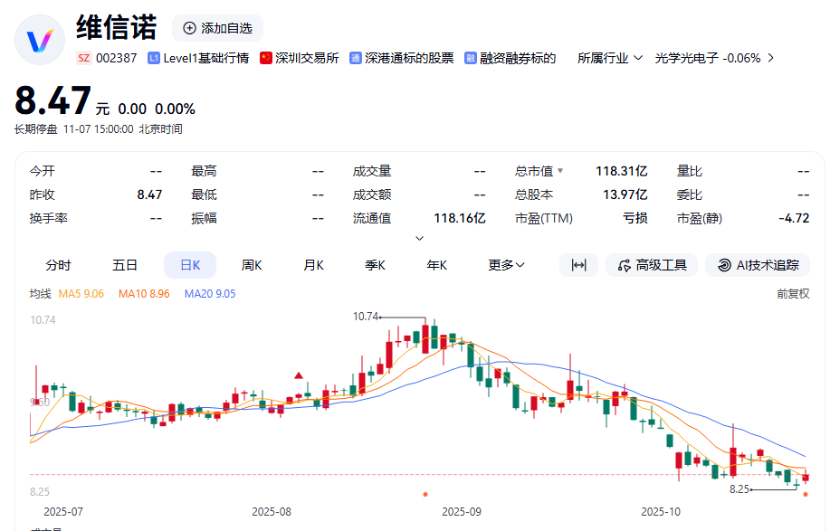 停牌前,维信诺股价报8.47元/股,总市值为118.31亿元。