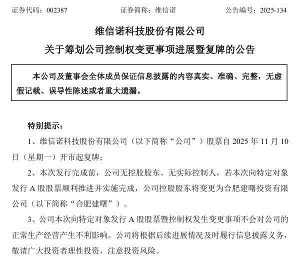 维信诺(002387)11月9日晚间公告,公司拟向股东合肥建曙投资有限公司(简称“合肥建曙”)定向发行4.19亿股股票,发行价格为7.01元/股,募集资金总额不超过29.37亿元,扣除发行费用后的募集资金净额拟全部用于补充流动资金及偿还公司债务。公司股票自2025年11月10日(星期一)开市起复牌。